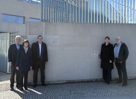 Im Gespräch mit Dr. Gesa Miehe-Nordmeyer, Abteilungsleiterin im Bundeskanzleramt für Sozial-, Gesundheits-, Arbeitsmarkt-, Umwelt- und Gesellschaftspolitik, und Dr. Hannah Schepers, Referatsleiterin im Bundeskanzleramt für die Kommunikation mit Kirche und Caritas, diskutierten sie über die Zukunft der Sozialpartnerschaft in Deutschland. Nebeling und Schniedermann stellten dabei auch Arbeit und Auftrag des BKU vor: Wirtschaft und Gesellschaft in christlicher Verantwortung mitzugestalten. Ebenfalls nahmen Uta Losem, stellvertretende Leiterin des Katholischen Büros in Berlin, und Hermann Hölscheidt, Diözesansekretär der KAB Münster, an dem Treffen teil.