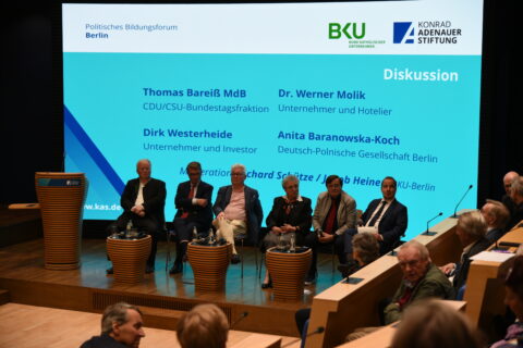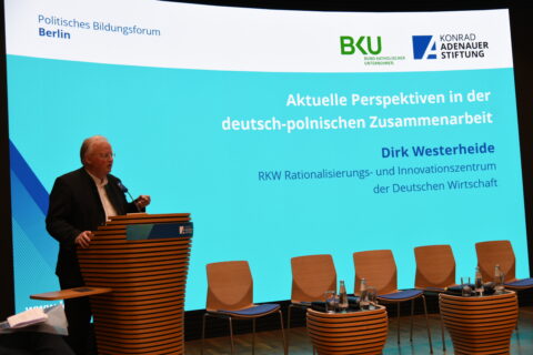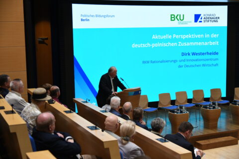 Nach einer Begrüßung durch Richard Schütze (BKU Berlin-Brandenburg) und Dr. Joachim Klose (Landesbeauftragter für Berlin und Leiter des Politischen Bildungsforums Berlin der KAS) boten kurze Impulsvorträge vielfältige Einblicke in aktuelle Entwicklungen und Perspektiven der deutsch-polnischen Zusammenarbeit.
