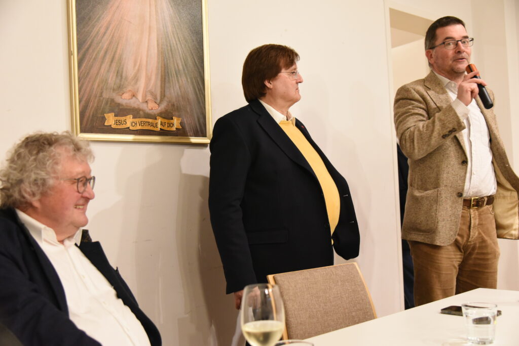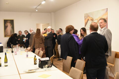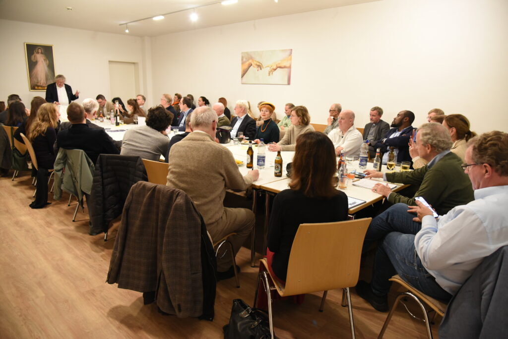Gestärkt durch die Andacht, die Impulse der Predigt von Pfarrer Dr. Josef Wieneke und die Eucharistie betraten wir in den Vortragssaal. 25 Personen waren angemeldet – 40 kamen. Wo es eng ist, wird’s gemütlich. Alle waren schon beim Stühlerücken munter im Gespräch.