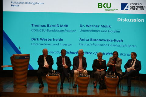 Nach einer Begrüßung durch Richard Schütze (BKU Berlin-Brandenburg) und Dr. Joachim Klose (Landesbeauftragter für Berlin und Leiter des Politischen Bildungsforums Berlin der KAS) boten kurze Impulsvorträge vielfältige Einblicke in aktuelle Entwicklungen und Perspektiven der deutsch-polnischen Zusammenarbeit.