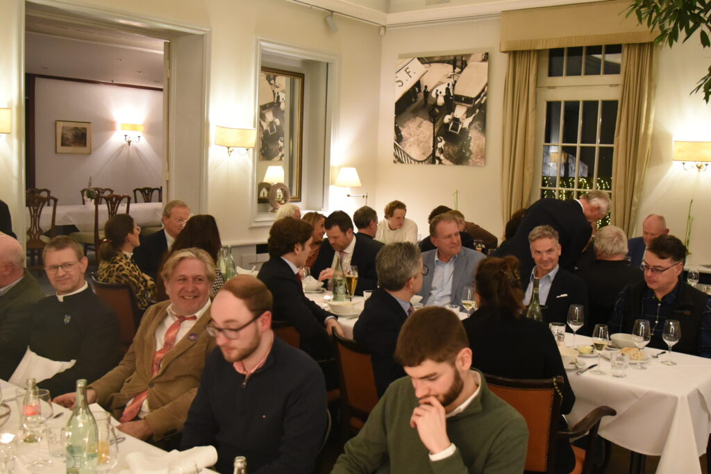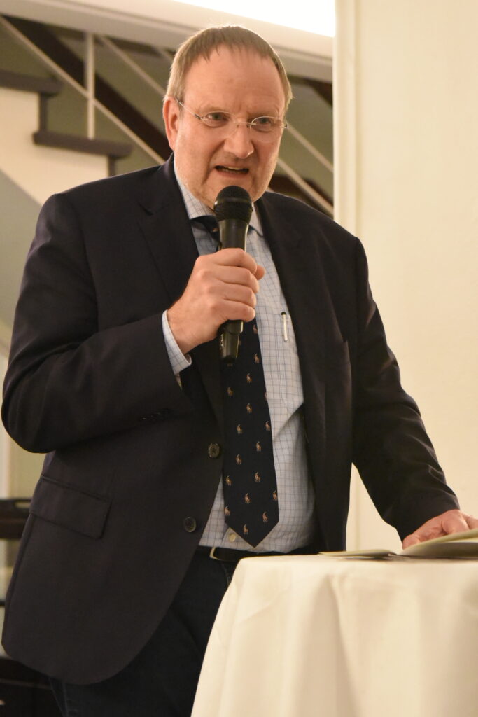 Ein Potpourri von zum Teil aufrüttelnden Tatsachen und Meinungen – imponierend und anregend vorgetragen. Alle hörten gebannt zu, auch wenn der Vortrag mit einem Ausblick auf die Zukunft kein einfaches „Happy End“ verheißen konnte – außer natürlich der Hinweis auf Menue-„Hauptgang“ mit wahlweise Entenkeule, Fisch oder das vegetarische Essen. Alles schmeckte allen ganz ausgezeichnet.