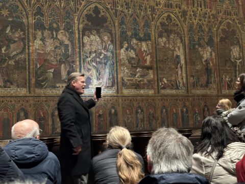 Nach dem Hochamt folgte ein aufschlussreicher Vortrag von Dr. Dominik Meiering, der im Chor des Doms stattfand. In seinem Vortrag vermittelte er den Teilnehmern faszinierende Einblicke in die Verehrungen und Glaubenszeugnisse des Mittelalters. Dr. Meiering erklärte eine Vielzahl von Kunstwerken, die im Zusammenhang mit der Geschichte des Glaubens und der Verehrung im Kölner Dom stehen. Seine Ausführungen waren nicht nur informativ, sondern auch inspirierend und regten die Anwesenden dazu an, über die tiefere Bedeutung der Kunstwerke und deren Einfluss auf den Glauben nachzudenken.