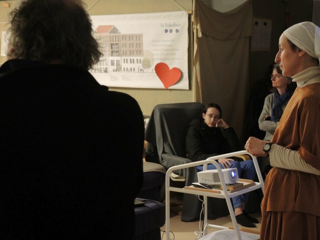 Die Gemeinschaft Brot des Lebens ist eine katholische geistliche Gemeinschaft, deren Gemeinschaftsmitglieder Jesus in einem einfachen Lebensstil nachfolgen. In den Gemeinschaftshäusern leben die Mitglieder – Laien und Kleriker (Diakone und Priester), Ledige, im Zölibat Geweihte, Verheiratete und Familien mit deren Kindern – oft mit Bedürftigen und Gästen gemeinsam unter einem Dach. So bildet die Gemeinschaft mit den Armen und Kleinen ein Volk, das Jesus Christus in der Eucharistie, dem Sakrament der Liebe, anbetet. In Berlin gründete sich die Gemeinschaft 1990 und ist seit 2004 in St. Nikolaus in Berlin- Friedrichshain ansässig. Täglich gibt es bis zu 7 Stunden Anbetung und Gebet – in den Wintermonaten leitet Brot des Lebens die Notübernachtung St. Pius/St. Nikolaus. Schwester Marthe von der Gemeinschaft stellte uns die Arbeit vor und brachte uns das Projekt „Kirche unterm Dach St. Nikolaus“ näher.